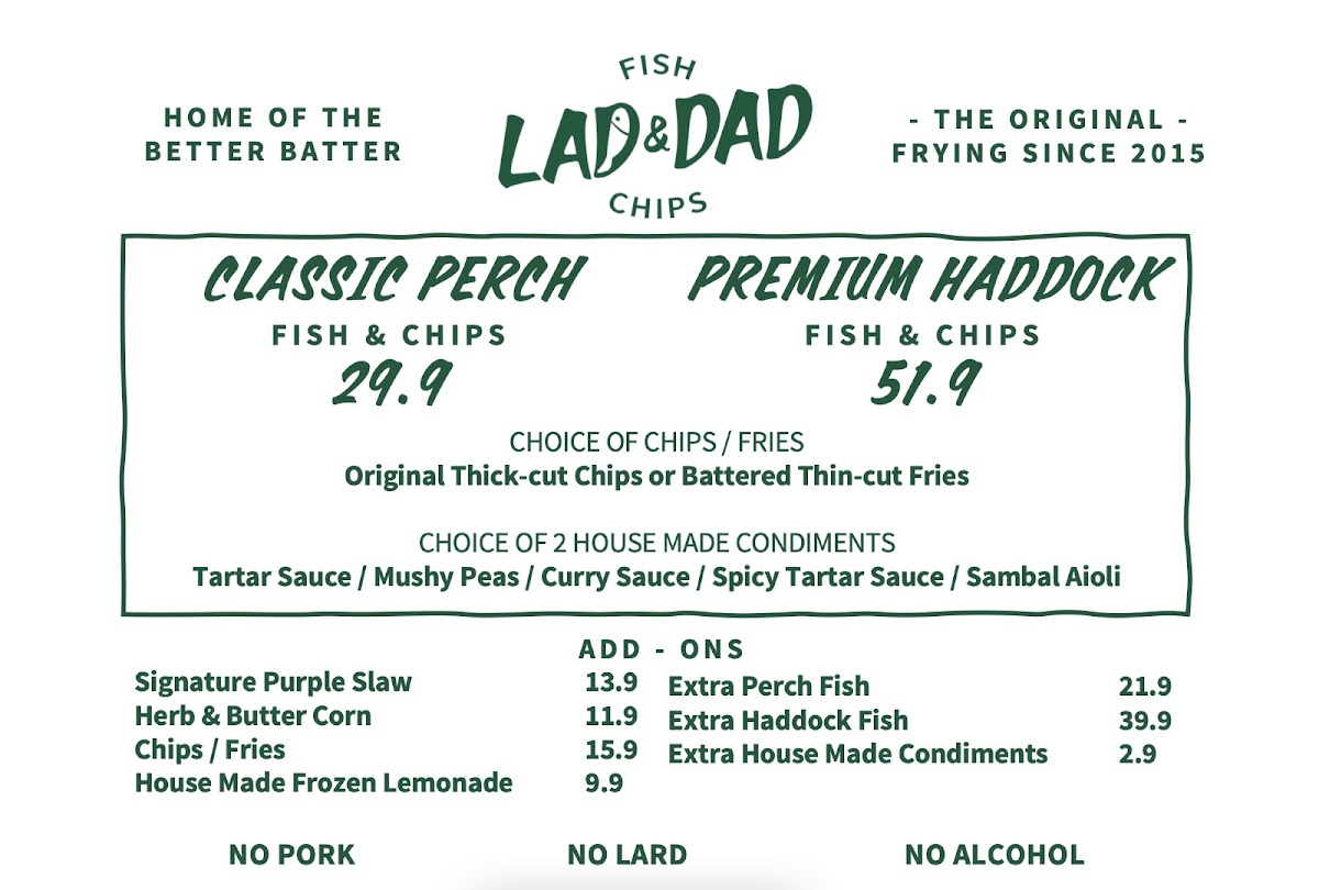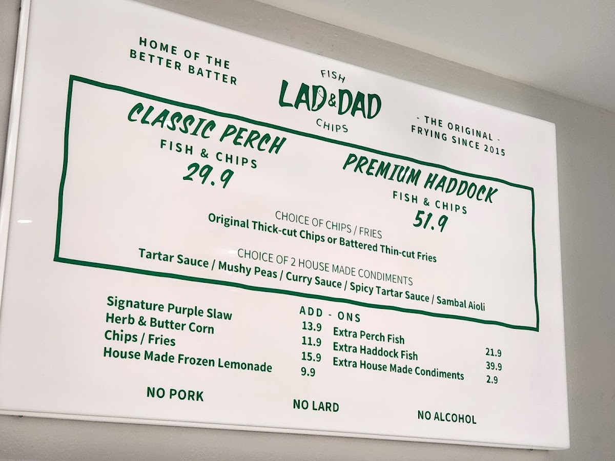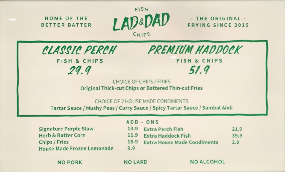 Introducing LAD & DAD, the newest fish and chips sensation tucked away in the heart of Kuala Lumpur at Wisma Cosway. This establishment specializes in delivering quality dishes featuring crispy, golden fish with a choice of flaky perch or premium haddock. With prices starting at RM 29.90, each serving includes mushy peas and tartar sauce, making it a true comfort meal.
